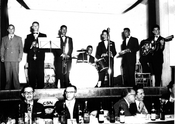 A Orquestra Ases da Melodia, em foto feita no ano de 1957. Da esquerda para a direita, os músicos Alvacir Bressiani, Carioca, Orlando de Deus, José Haroldo, Amaury de Oliveira e Lauro.