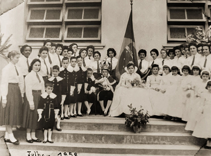 Alunos e professores na Festa do Divino Espírito Santo, em 1958, no Colégio São José, em Tubarão.