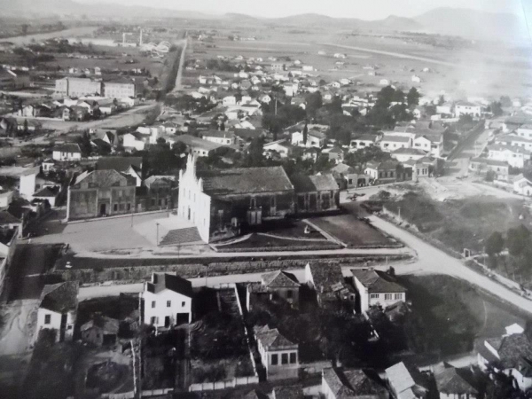 Antiga igreja matriz de Tubarão, que deu lugar à Catedral. No canto esquerdo e superior aparece o Hospital Nossa Senhora da Conceição.