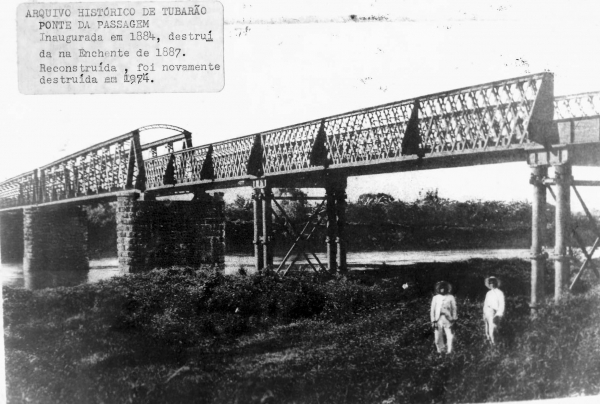 Antiga ponte férrea do bairro Passagem, em Tubarão, inaugurada em 1884 e destruída na enchente de 1887. Estrutura foi reconstruída e novamente danificada em 1974.