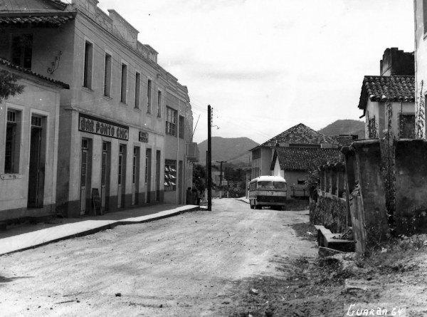 Antigo prédio do Hotel Sandrini e o ônibus da empresa Santo Anjo da Guarda, cuja primeira linha autorizada era Guarda-Centro de Tubarão. Imagem de 1964.