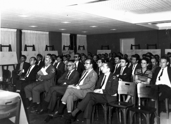 Dilney Chaves Cabral, Stélio Boabaid, Irineu Brodbeck, entre outras pessoas, no auditório da Câmara de Vereadores, prédio do antigo Fórum, por ocasião da posse de Stélio como prefeito de Tubarão.