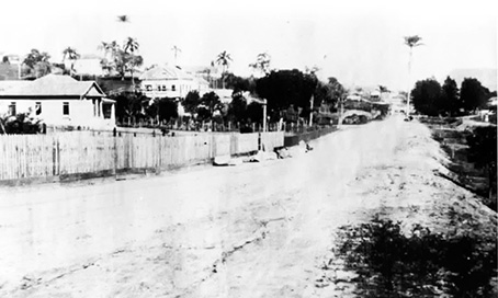 Avenida Rodovalho na década de 1950. Na direita hoje se localiza o Centro Municipal de Cultura e à esquerda, no lado superior, está a Vila dos Engenheiros, onde hoje é o Paço Municipal.