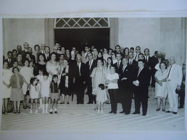 Bodas de ouro na Igreja Matriz de Oficinas. David Luiz Bittencourt e Emília Corrêa Bittencourt completavam 50 anos de casados. Fotografia de 31 de dezembro de 1967. Os convidados foram recepcionados para a festa na casa de João Gualberto Corrêa de Bittencourt (filho do Sr. David) e sua esposa, a Sra. Ester Benedet Bittencourt. Fonte: Igreja Matriz São José Operário.