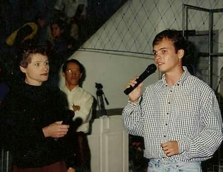 Cantor Dudu Fileti cantando o Hino Nacional na abertura dos Jogos Intercooperativas, em Armazém, no ano de 1998. Com ele, dona Darlete, e ao fundo o seu Evaristo Nascimento. Dudu foi destaque no “The Voice Brasil”, da Rede Globo, em 2015.