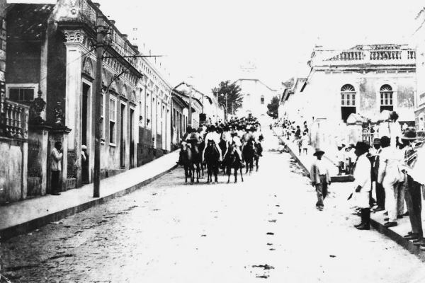 Cavalgada política na descida da rua Coronel Collaço, no Centro de Tubarão, em 1921.