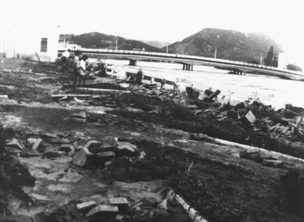 Centro de Tubarão após a enchente de 1974, que completa 44 anos neste sábado. Imagem feita da pracinha, na altura da rua Lauro Müller.