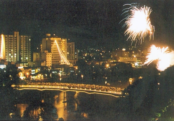 Ponte Nereu Ramos e Heriberto Hülse, com decoração de Natal, durante a chegada do Papai Noel no Centro de Tubarão. Imagem sem data específica.