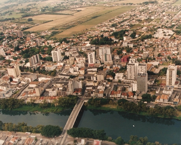 Foto aérea feita da margem esquerda de Tubarão mostrando parte do rio e do Centro da Cidade Azul. O registro é de 1995.