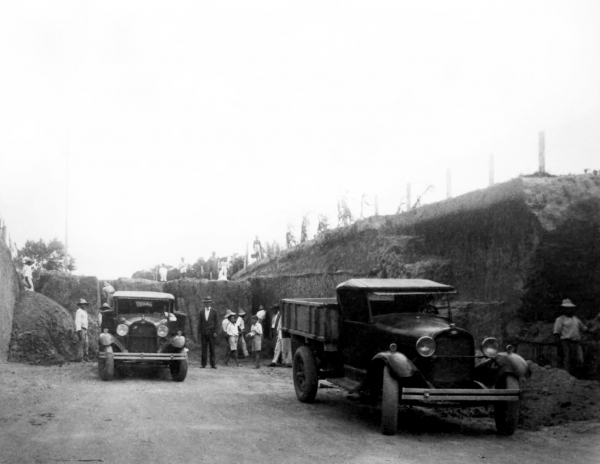 Construção da parte alta da rua Vidal Ramos, perto do encontro com a Conselheiro Mafra, em Tubarão, em registro do ano de 1933.