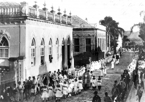 Cortejo de primeira comunhão, passando pelos trilhos e subindo para a Catedral, pela rua Coronel Collaço, em Tubarão, no ano de 1913.