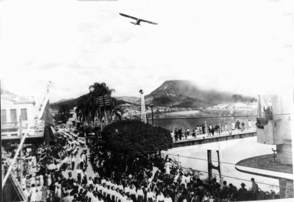 Imagem mostra desfile cívico em Tubarão, concentrado na rua Lauro Müller.