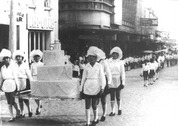 Desfile na rua Coronel Collaço, esquina com Coronel Cabral, no Centro de Tubarão, festejando os 50 anos do Colégio Hercílio Luz, em 1970.