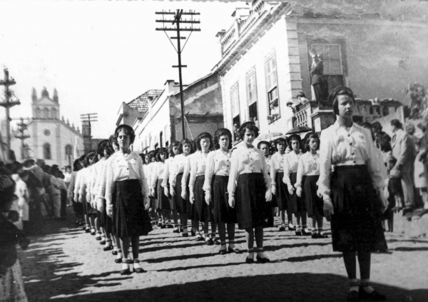 Desfile de Sete de Setembro na rua Coronel Collaço, com a antiga Catedral de Tubarão de fundo, em 1970.