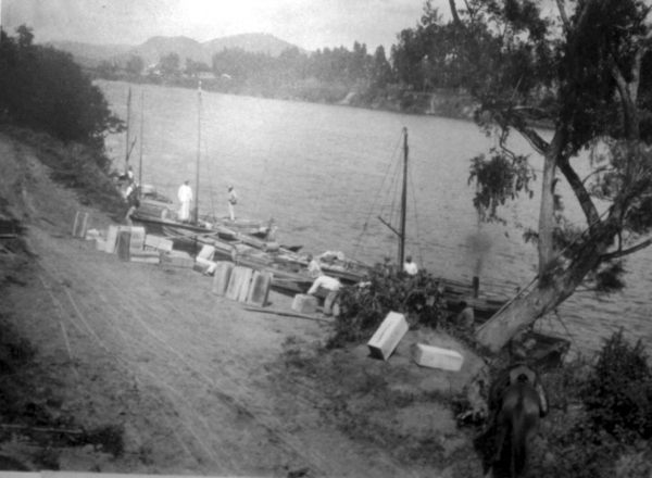 Atracadouro de embarcações para entrega de mercadorias em Tubarão na rua Lauro Müller, onde hoje é a Praça Centenário. A imagem é de 1932.