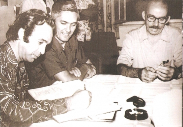 Osvaldo Della Giustina assinando a escritura do Colégio Dehon, tendo à esquerda o pe. Piazeira e o prefeito de Tubarão Dilney Chaves Cabral, em cujo mandato foi implantado o ensino superior em Tubarão.