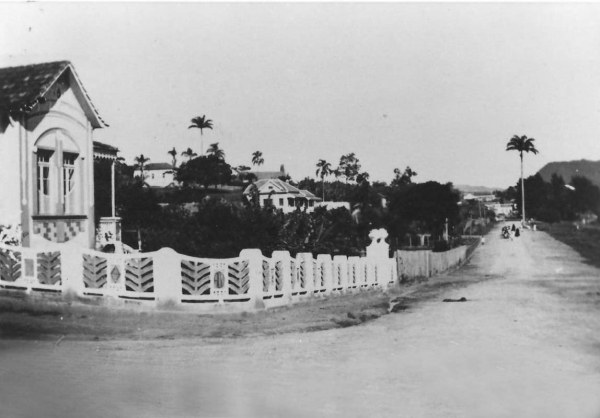 Esquina da avenida Rodovalho com a Vidal Ramos, em direção à Praça 7 de Setembro, em fotografia de 1930.