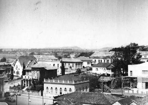 Esquina das ruas Coronel Collaço e Coronel Cabral, onde é possível ver a Mansão Balsini e, um pouco antes, o prédio da antiga Casa das Louças (ao longo do trilho). O Clube 29 de Junho, no canto direito, estava em construção.