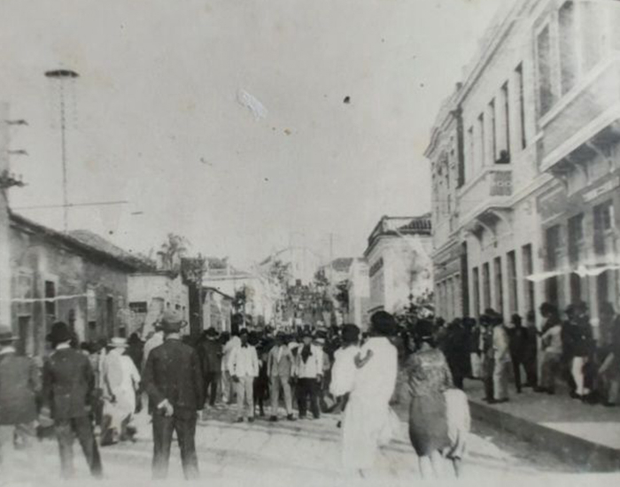 Festejos na rua Coronel Collaço, no Centro de Tubarão, em 1932.