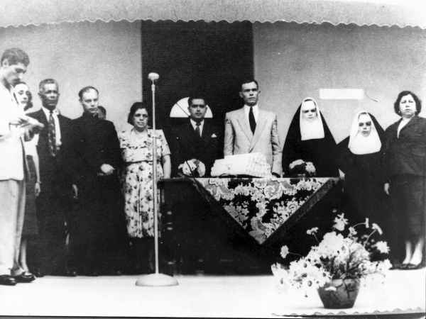 Formatura no Colégio Hercílio Luz em 1950, com a presença do prefeito Francisco Carlos Régies e do inspetor Lauro Locks.