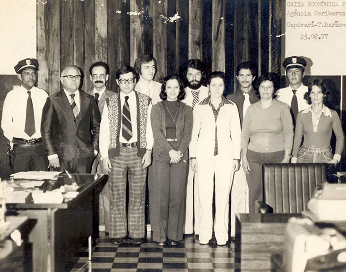 Funcionários da agência da Caixa Econômica em Capivari de Baixo, quando ainda era um bairro de Tubarão, em 1977. O gerente era o seu Cornélio Vieira Neves, que completou 100 anos no fim de agosto.
