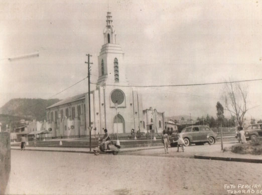 Igreja Matriz de Oficinas, em Tubarão, na década de 60. Detalhe para a antiga igreja ao lado, demolida posteriormente.