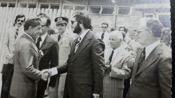 Inauguração da Alusud (hoje Alcoa) em janeiro de 1977 em Tubarão. À direita, cumprimentando o então ministro Severo Gomes, o ex-prefeito Irmoto Feuerschuette, conceituado médico que governou a cidade por dois mandatos.