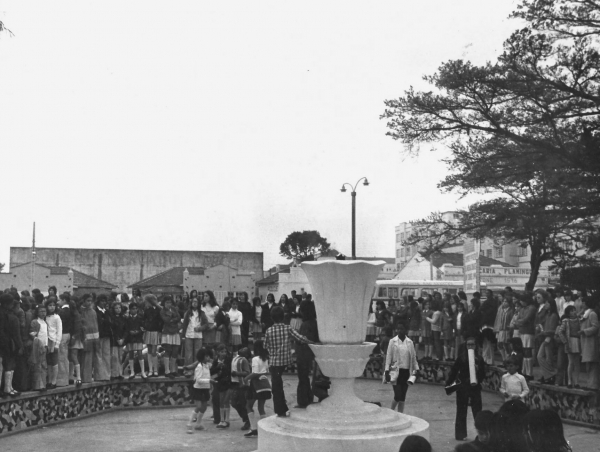 Inauguração do antigo chafariz na praça Nereu Ramos, no Centro de Tubarão, onde hoje existe a pista de skate, com o Hospital Nossa Senhora da Conceição (HNSC) ao fundo.