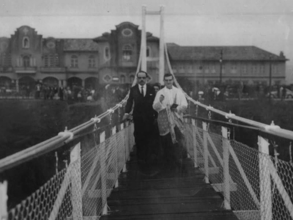 Inauguração da ponte pênsil em frente à Unisul, em Tubarão, com a presença do prefeito Dilney Chaves Cabral, em 1960.