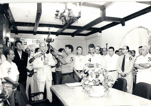 Prefeito de Tubarão Irmoto Feuerschuette com Leodegar Tiscoski, deputado na época, ao seu lado. No canto direito está Geraldo Althoff.