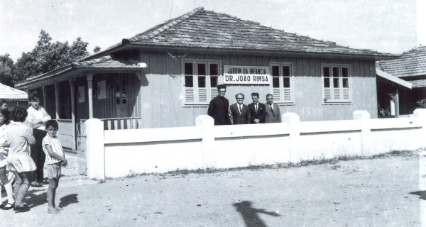 Imagem do jardim de Infância Doutor João Rimsa, em Imbituba. Na foto: Pe. Itamar Luiz da Costa, João Rimsa, prefeito Edward Araújo e Paulo Carneiro.