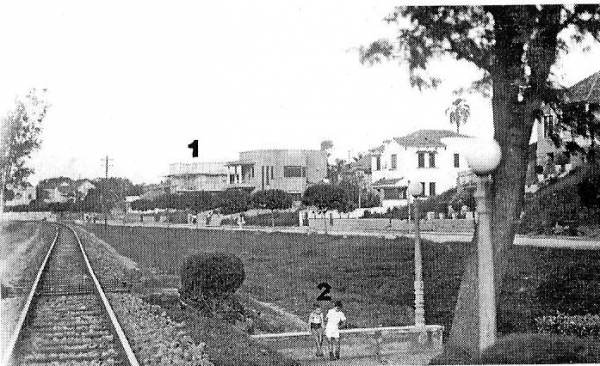 Linha férrea passando ao longo da Praça 7 de Setembro, em direção ao hospital de Tubarão, no ano de 1950.
