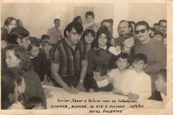 Lotadores Stinner, Duende, El Cid e Juliano atandendo aos fãs no Hotel Palermo, em Tubarão, no ano de 1967. Na imagem também aparecem as então crianças Luiz Gonzaga Zim Júnior, César Soares Zim e Sílvio Soares.