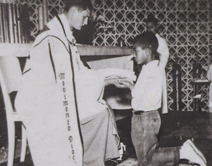 Manoel Militão (Maneca) recebendo a batina de coroinha do padre Pacífico, na igreja São José Operário, de Oficinas, em 1965.