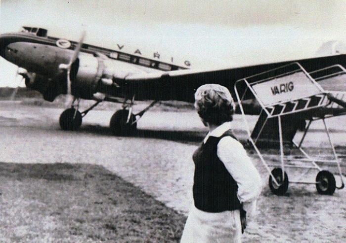O avião da Varig que fazia a linha Tubarão a Florianópolis, pousando no aeroporto de Tubarão, em 1965.