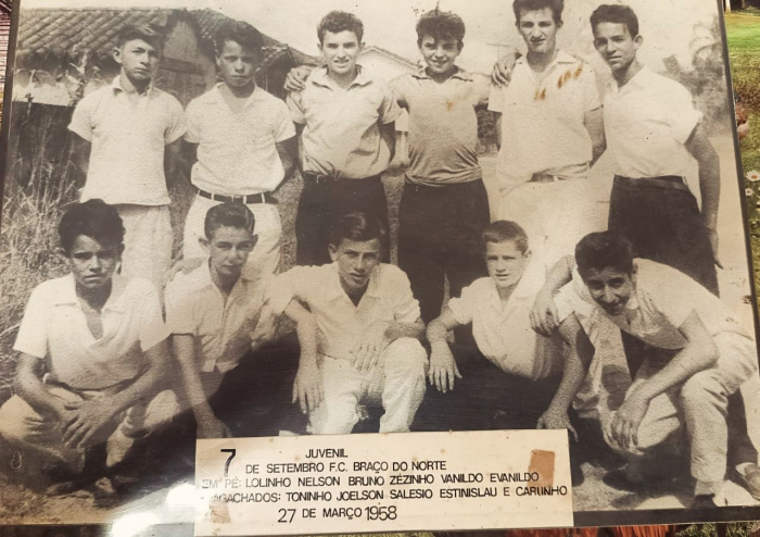 O juvenil do 7 de Setembro, de Braço do Norte, em 27 de maio de 1958. Em pé: Lolinho, Nelson, Bruno, Zezinho, Vanildo e Evanildo. Agachados: Toninho, Joelson, Salésio, Estanislau e Carlinho.