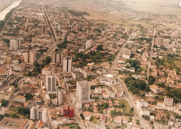 Imagem aérea feita de Oficinas, mostrando o Centro de Tubarão, a Catedral e a Vila Moema, em 1995.