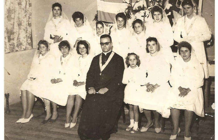 Padre Luiz de Souza Ávila com as Filhas de Maria, na comunidade de Rio Vargedo, em Treze de Maio, no ano de 1963.
