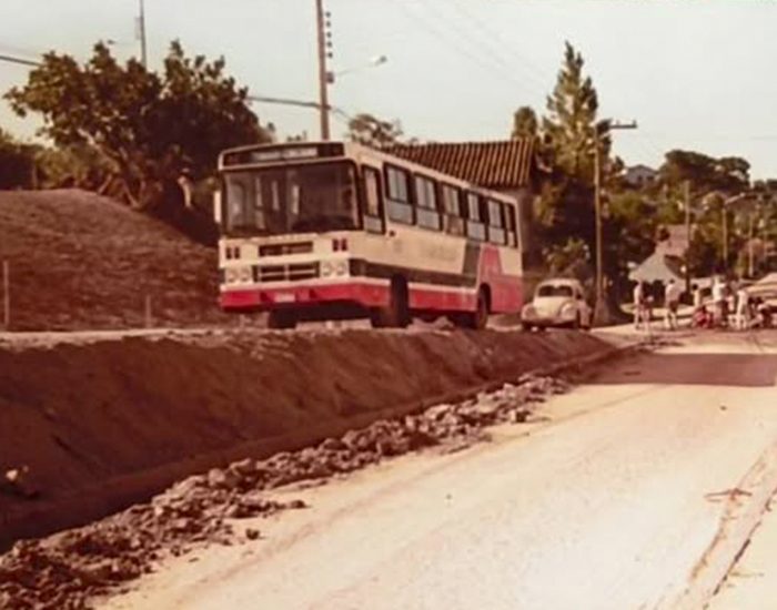 Pavimentação do conhecido entrocamento na rua Silvio Cargnin, entre os bairros Oficinas e Monte Castelo, em Tubarão, na década 80.