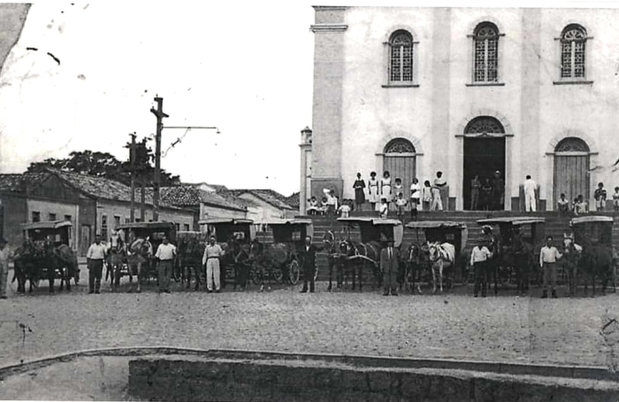 Proprietários de carruagens e seus veículos, na década de 1940, posam na frente da antiga Catedral de Tubarão, que foi demolida em 1971.