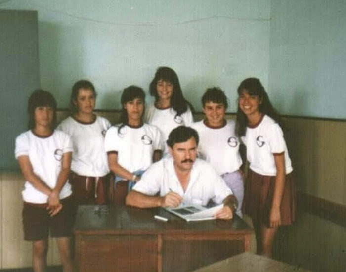Querido professor de Química, Luiz Fernando de Oliveira, o Xexéu, com alunos do terceirão do Colégio São José, em Tubarão, nos anos 90.