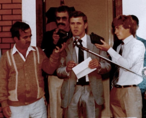 Inauguração da Rádio Verde Vale, em 22 de maio de 1985, com a presença de muitas autoridades regionais. Na foto, da esquerda para a direita: José Carlos Aguiar, Eliseu Martins, Arilton Barreiros e José Nei Ascari.