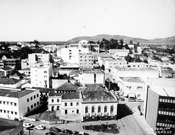 Registro feito no ano de 1971 da área central de Tubarão. Na foto, aparecem o Palacete Cabral, ainda com o prédio completo, e o então novo prédio da Catedral da cidade. 1971 na área central de TB