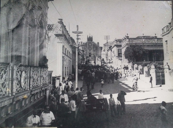 Rua Coronel Collaço, em Tubarão, no ano de 1946, em direção à antiga Igreja Matriz, que é hoje a Catedral.