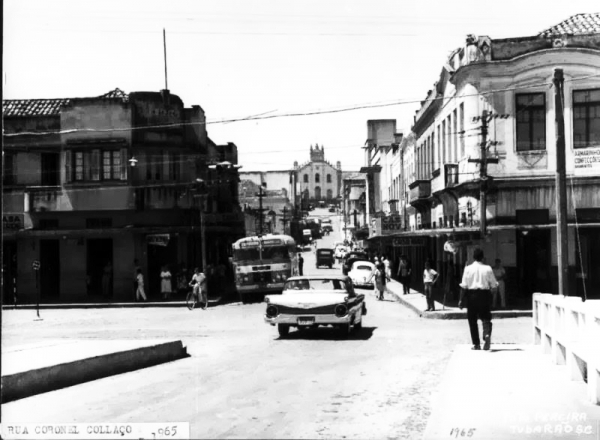 Rua Coronel Collaço, no Centro de Tubarão, em 1965, podendo ver a antiga igreja.