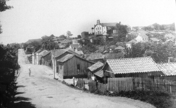 Rua São José em 1932. No fundo aparece a antiga Catedral de Tubarão.