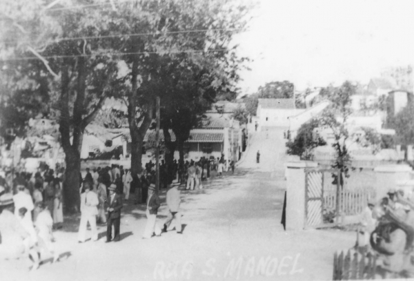 Rua São Manoel, no Centro de Tubarão, passando pela Praça 7 de Setembro e subindo em direção à rua Piedade, em 1930.