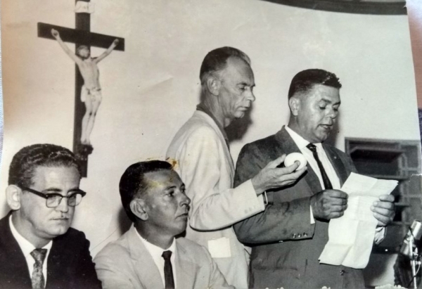 Solenidade no Sindicato dos Trabalhadores do Carvão, em 1960. Na imagem, aparece o radialista João Kuerten, que foi proprietário da Rádio Santa Catarina, cobrindo o evento. Arquivo Homero Roberge.