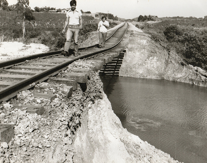Situação da linha férrea, em direção a Lauro Müller, após a enchente de 1974.