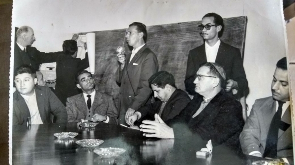 Solenidade no Sindicato dos Trabalhadores da CSN, 1959. Na oportunidade, Eng. Lírio Burigo usando a palavra. Podemos observar o primeiro bispo de Tubarão, D. Anselmo Pietrulla. Imagem do acervo de Homero Roberge.